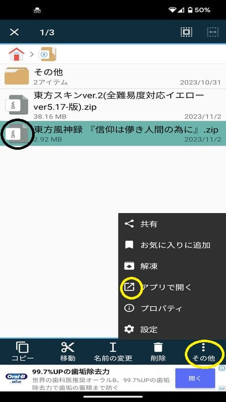 - ファイルマネージャーのアプリを開き、ダウンロード⇒東方スキンを長押し⇒右下のその他⇒アプリで開く⇒アーカイブビューアーをタップ⇒1回のみ